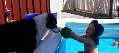 Fint besök av dottersonen under några varma sommardagar. Maximilian och Griima fann varandra vid poolen. Det lilla människobarnet försökte blöta ner hunden men lyckades inte så bra då koordinationen inte var så bra. När Griima hoppade i poolen och norpade bollen så skrattade den lilla killen högt.